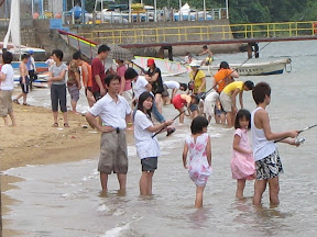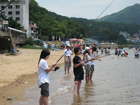 感覺好特別好奇妙,因為我未曾試過釣魚的位置o係係沙灘,係一個會有人游泳的地方但又唔會有人游近的邊界,對腳會浸係水到 (唔係用魚排,係用魚桿!好pro呀~~~~ ^^) 仲引左好多小朋友過黎睇到玩tim(係亞佩同東東個邊) !.<